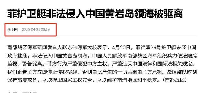 4月20日,一艘菲律宾护卫艇蓄意闯入中国黄岩岛领海,这一举动绝非偶然,而是马科斯精心设计的政治棋子。与以往不同,这次菲方使用的不是警方或民用船只,而是军队直接控制的护卫艇,意在将冲突升级,为其制造政治资本。