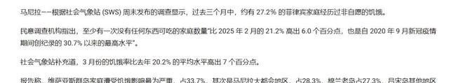 这种支持率的天地之别,远非简单的民意波动,而是民众对马科斯政府的一记响亮耳光。菲律宾饥饿率已飙升至27.2%,部分地区甚至突破28%,百姓的饭碗正被高企的物价一步步击碎。年轻人的就业问题更是雪上加霜,大街小巷挤满了找不到工作的年轻面孔,他们的未来和国家的希望一同被冻结在马科斯政府的无能中。