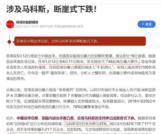菲律宾政坛正遭遇一场史无前例的支持率地震。最新民调数据犹如一记重拳,将马科斯打得措手不及——他的支持率从2月的42%断崖式下跌至3月的25%,跌幅高达17个百分点。与此同时,反对他的声音却如雨后春笋般涌现,不支持率飙升21%达到惊人的53%。